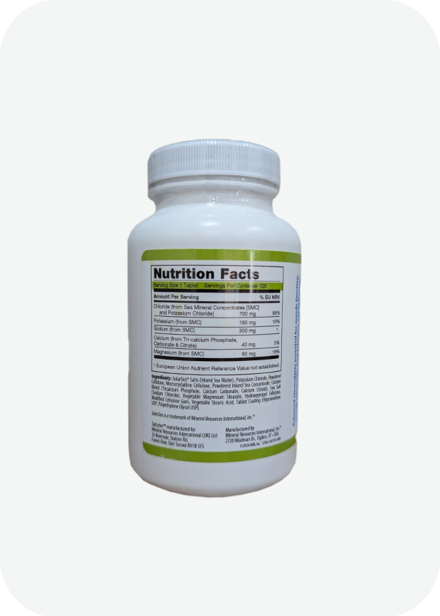 SolarSea® Salts (Inland Sea Water), Potassium Chloride, Powdereo Bellose, Microcrystalline Cellulose, Powdered Inland Sea Concentrate, Caldun Bend ical um Phosphate, Caldum Carbonate, Caldum Citrate), Sea Sat Modium Chloride, Vegetable Magnesium Stearate, Hydroxypropy Cellose. Usdifed cellulose Gum, Vegetable Stearic Acid, Tablet Coating (Hyprome lose. USP, Polyethylene Glycol USP).
