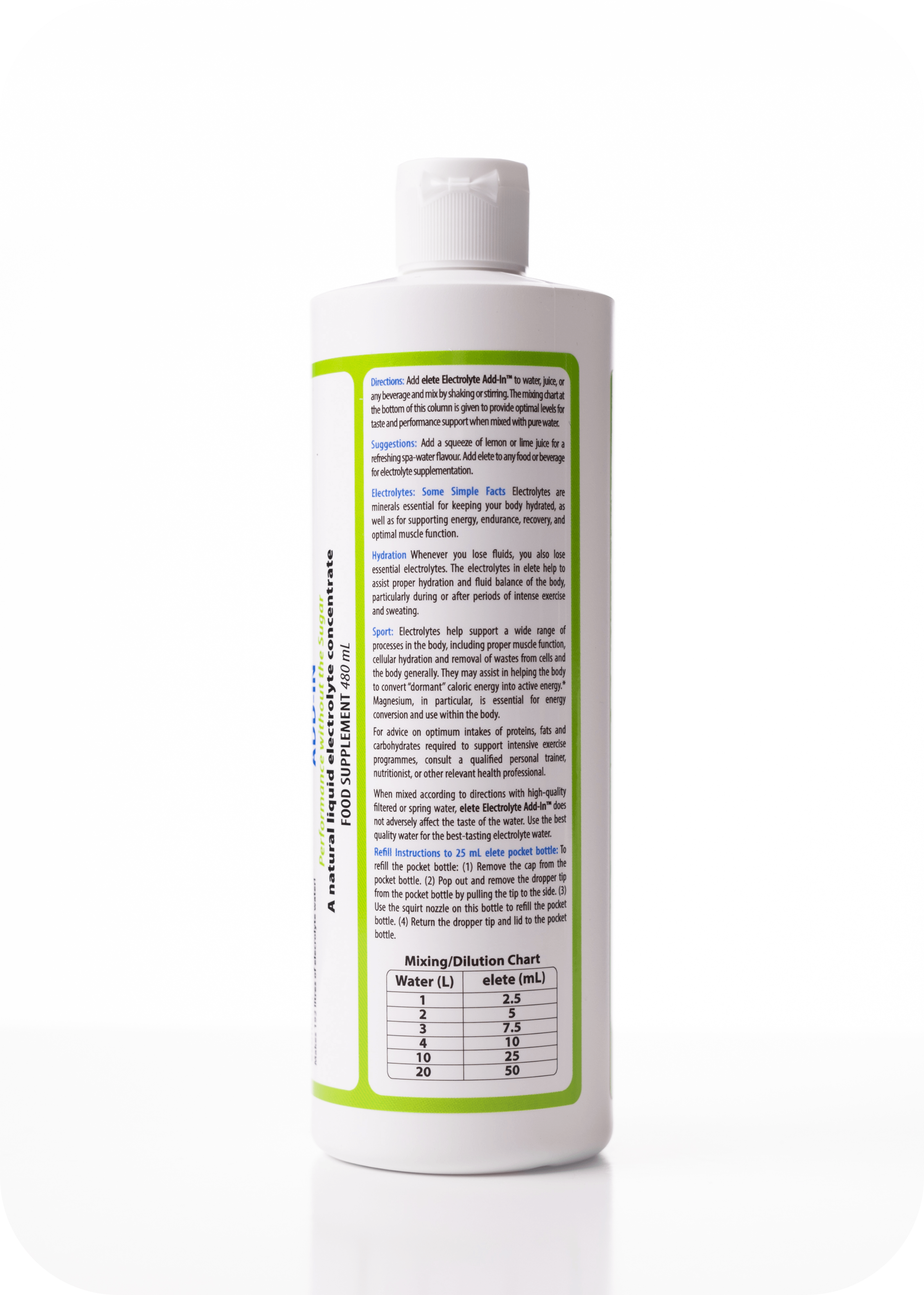 elete™ 480ml bottle makes 192 x 1 litre servings of electrolyte-fuelled hydration. The best value bottle of electrolyte concentrate available - great for teams to fill up individual pocket bottles.
